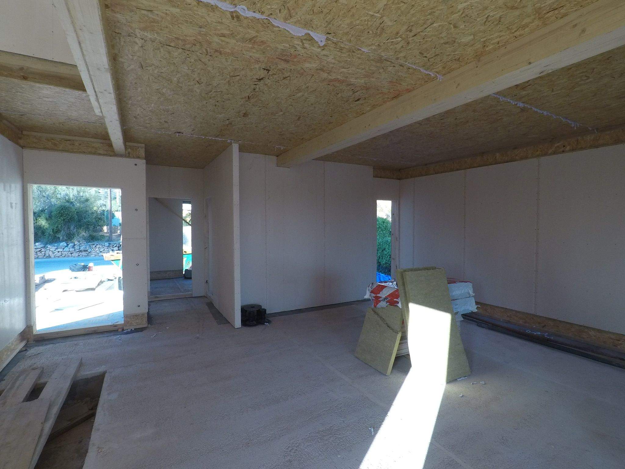Estructura dhabitatge unifamiliar a dos nivells construïda en entramat lleuger amb una façana acabada en sat. Les parets de l’edifici van ser prefabricades a les nostres instal·lacions per a més rapidesa i eficàcia a l’obra.